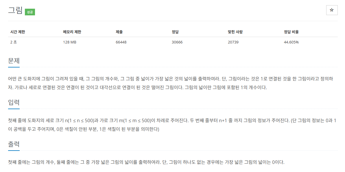 - 모든 탐색이 끝난 뒤 그림의 개수와 가장 큰 그림의 넓이를 차례대로 출력